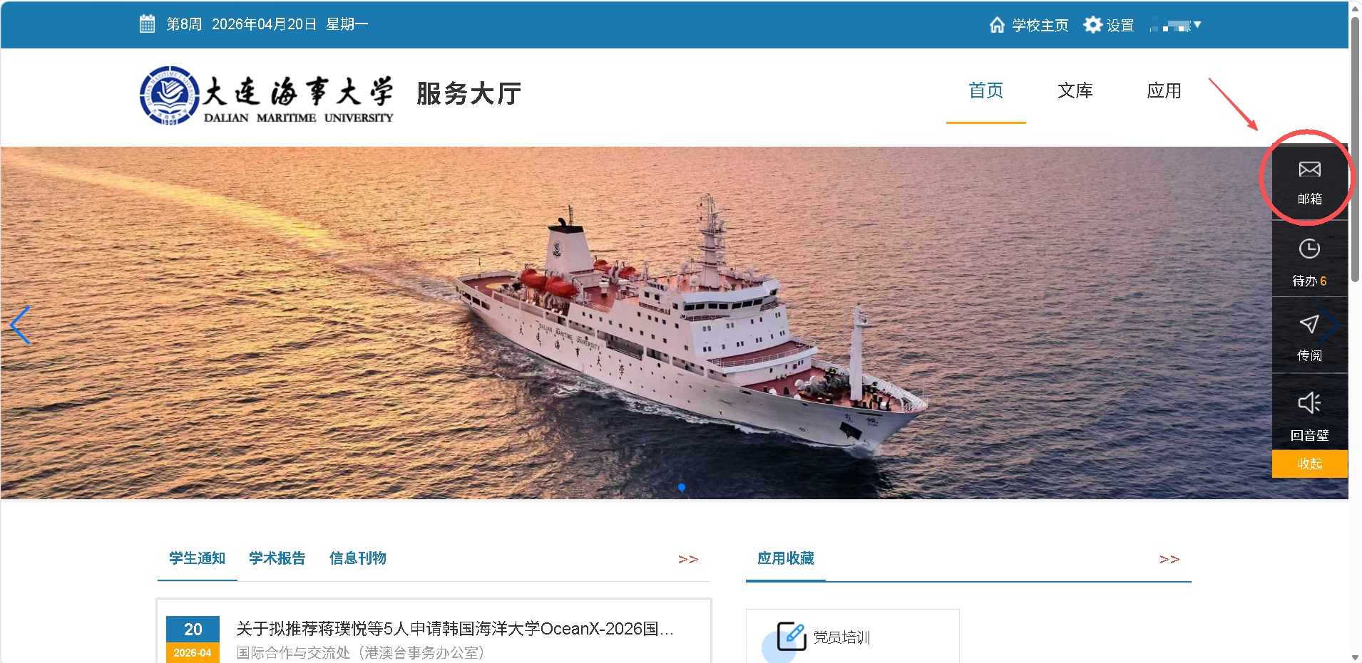 Step 1: 进入大连海事大学官网,点击服务大厅,右侧栏找到邮箱,点击进入